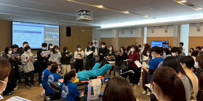最初に、参加者は手術看護認定看護師の中村先生から体位固定のポイントについて講義とデモンストレーションを受けました。その後、各体位実践ブースで実際に体位固定の実践、さらには自身が体位固定される患者側を体験し学びを深めました。